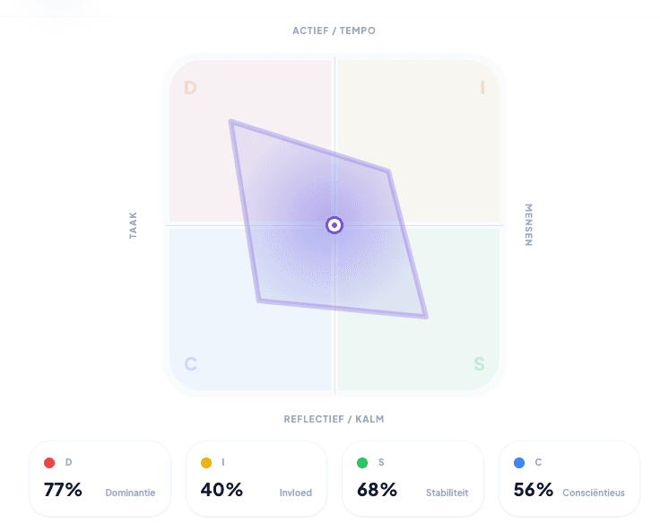 De coach bouwt een profiel op basis van jouw persoonlijkheid: je DISC-stijl, je Big Five-scores. Daardoor herkent hij jóuw patronen, op het moment dat ze spelen.